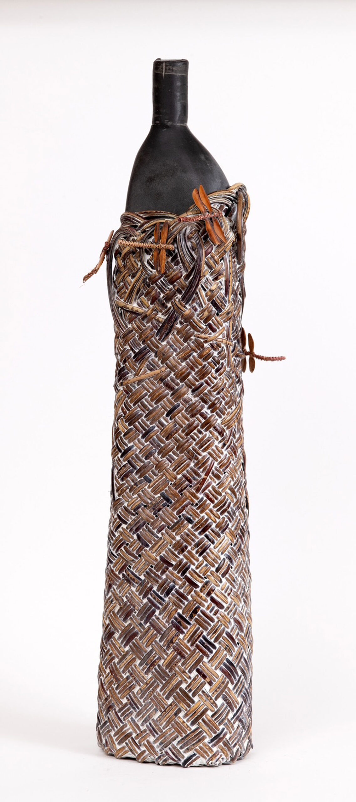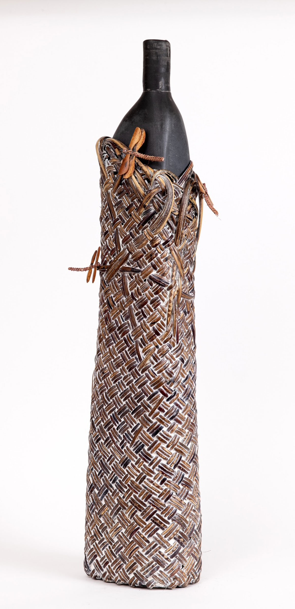 Deloss Webber’s connection to his art begins first with his deep connection to the environment. His sculptural works sometimes conceptual, sometimes abstract, are always immediate reminders of the beauty that is inherent in the natural world. Webber collects rocks of varying sizes and types choosing each one for its individual color, texture and markings. He then adds to the stone’s character by manipulating its surface and enhances it further by intricately weaving it in fibers such as cane, bamboo and reed. The fiber fits so seamlessly onto the body of the stone that it seems to have always been there. The language of the stone and the fiber thus becomes one.