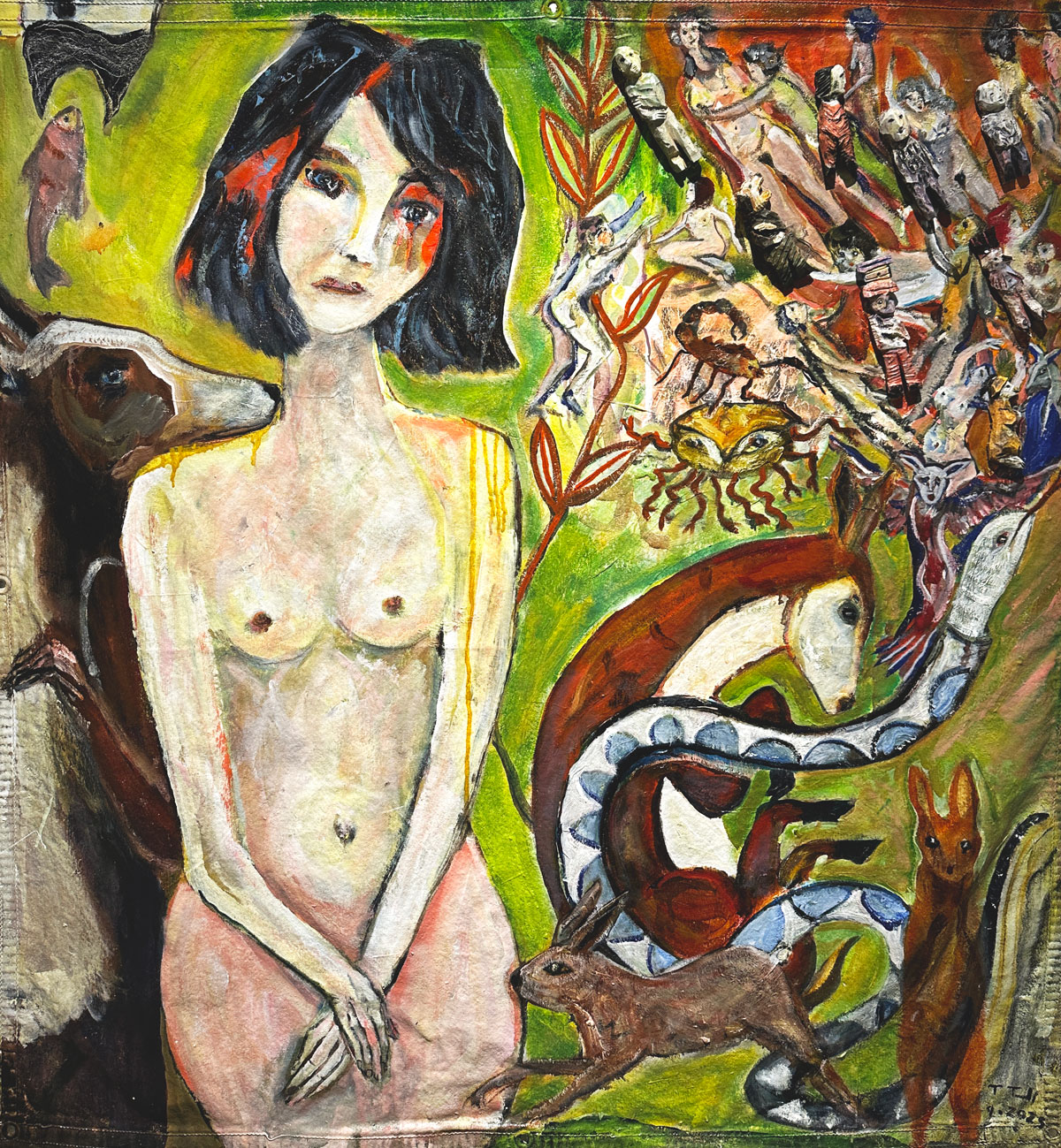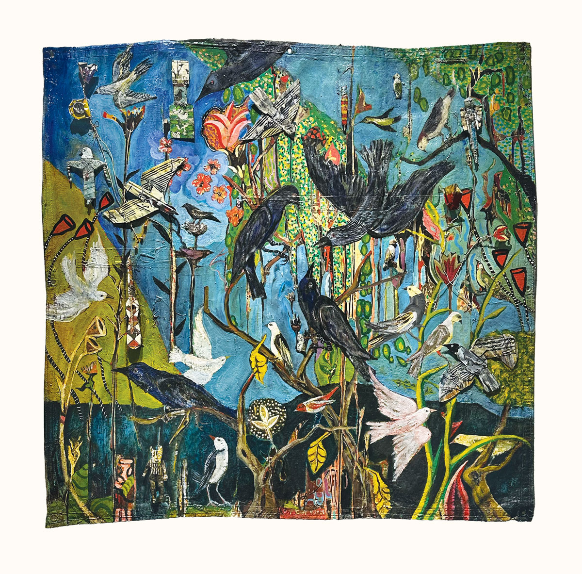 Oil, enamel, acrylic & mixed media assemblage on canvas tarp, 47.5 x 45.5 in, $16,000.00