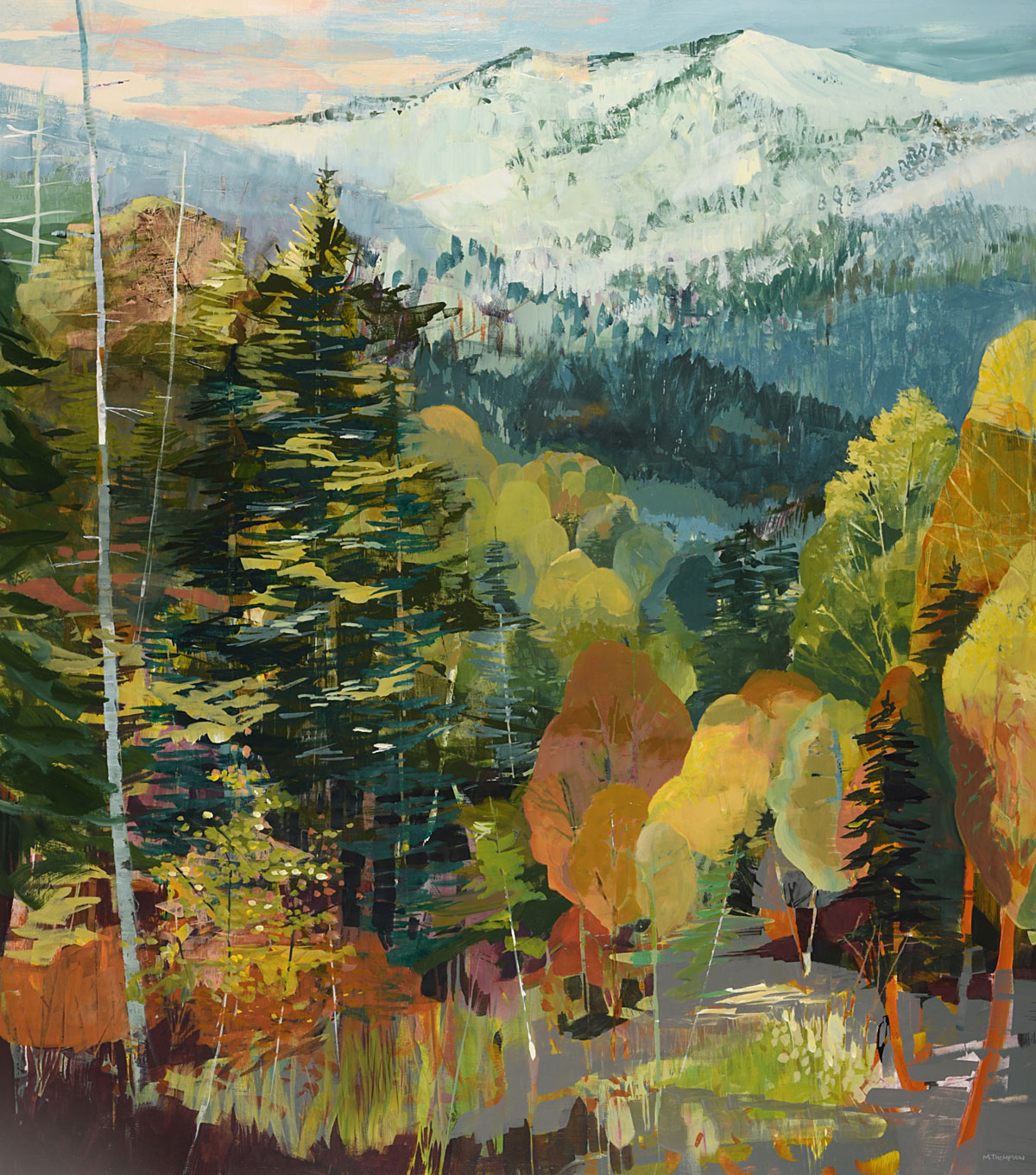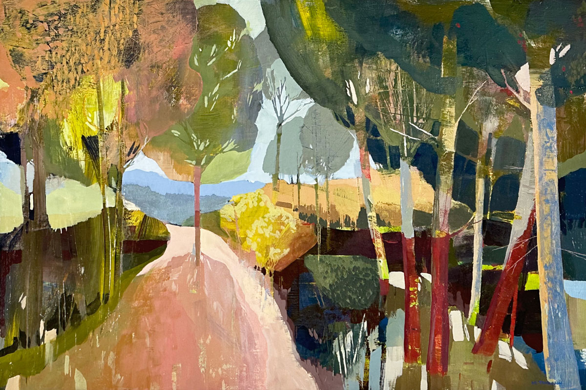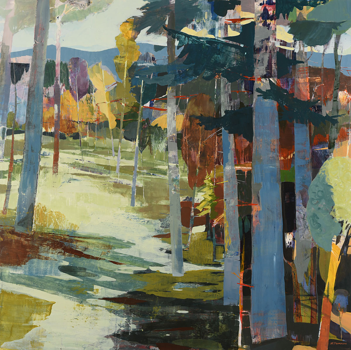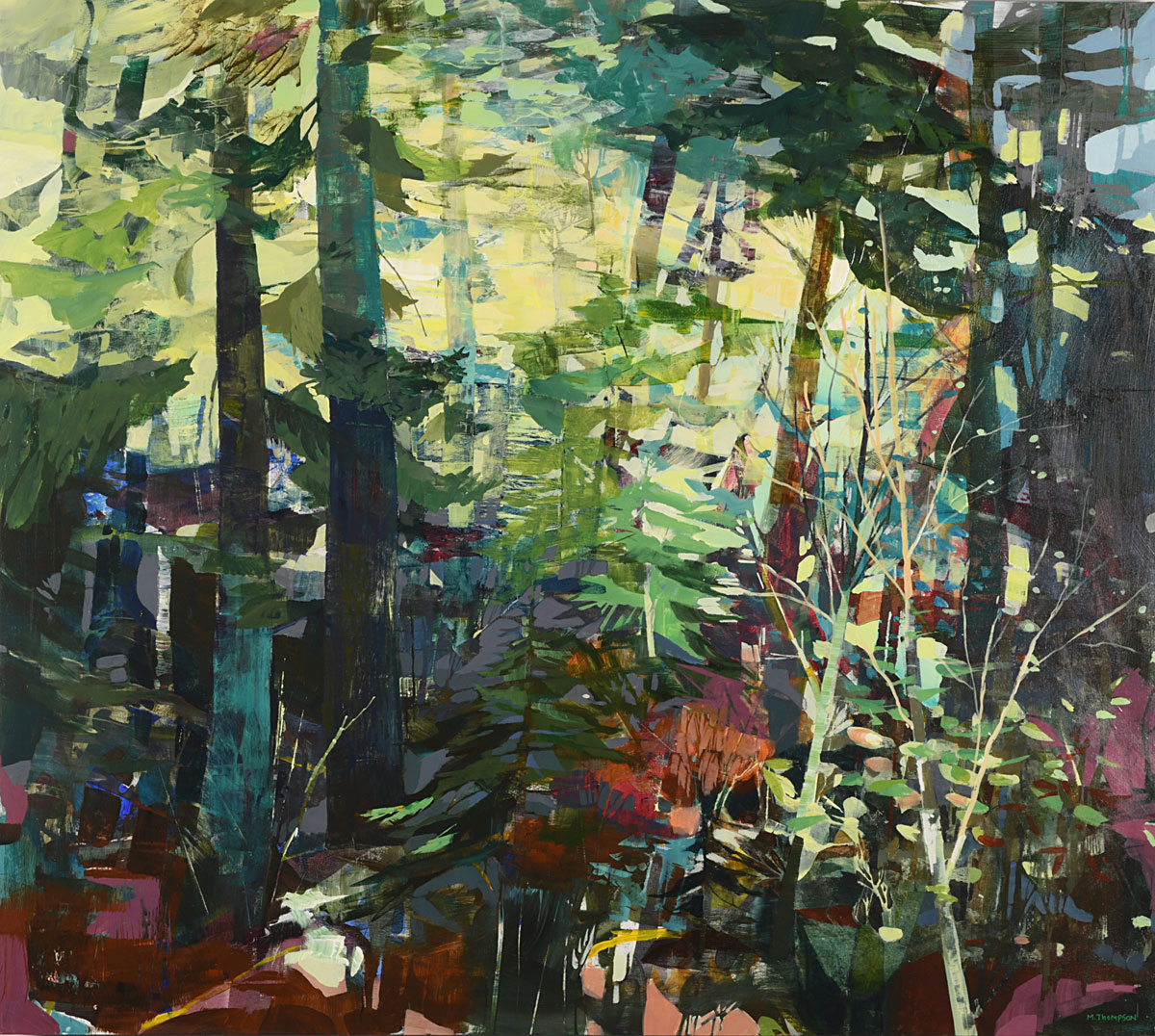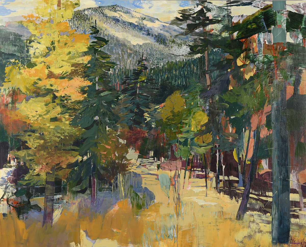 Thompson’s rich, layered and textural paintings offer portals into landscapes that feel both intimate and expansive. These semi-abstract forest and mountain landscapes are not depictions of specific places but are instead invitations—openings into a sensed terrain that lives between representation and abstraction. Each painting offers a moment of pause between here and there: a still point in the forest, a threshold of light, a meandering path or dissolving waterway, a glimmer of what might lie just beyond view.