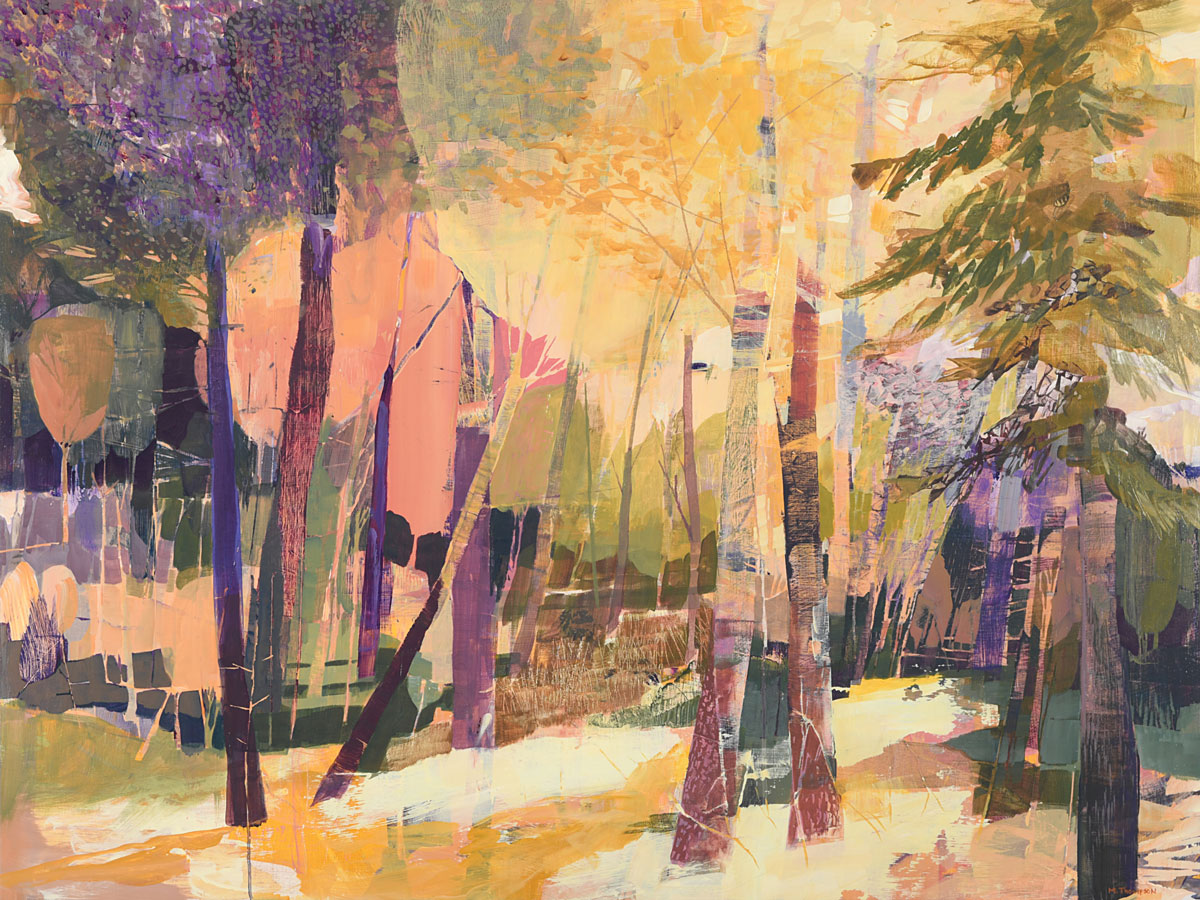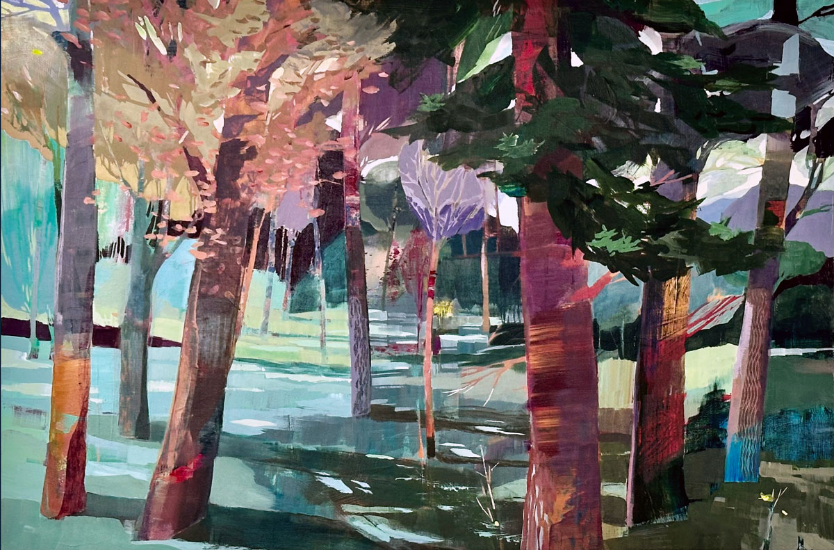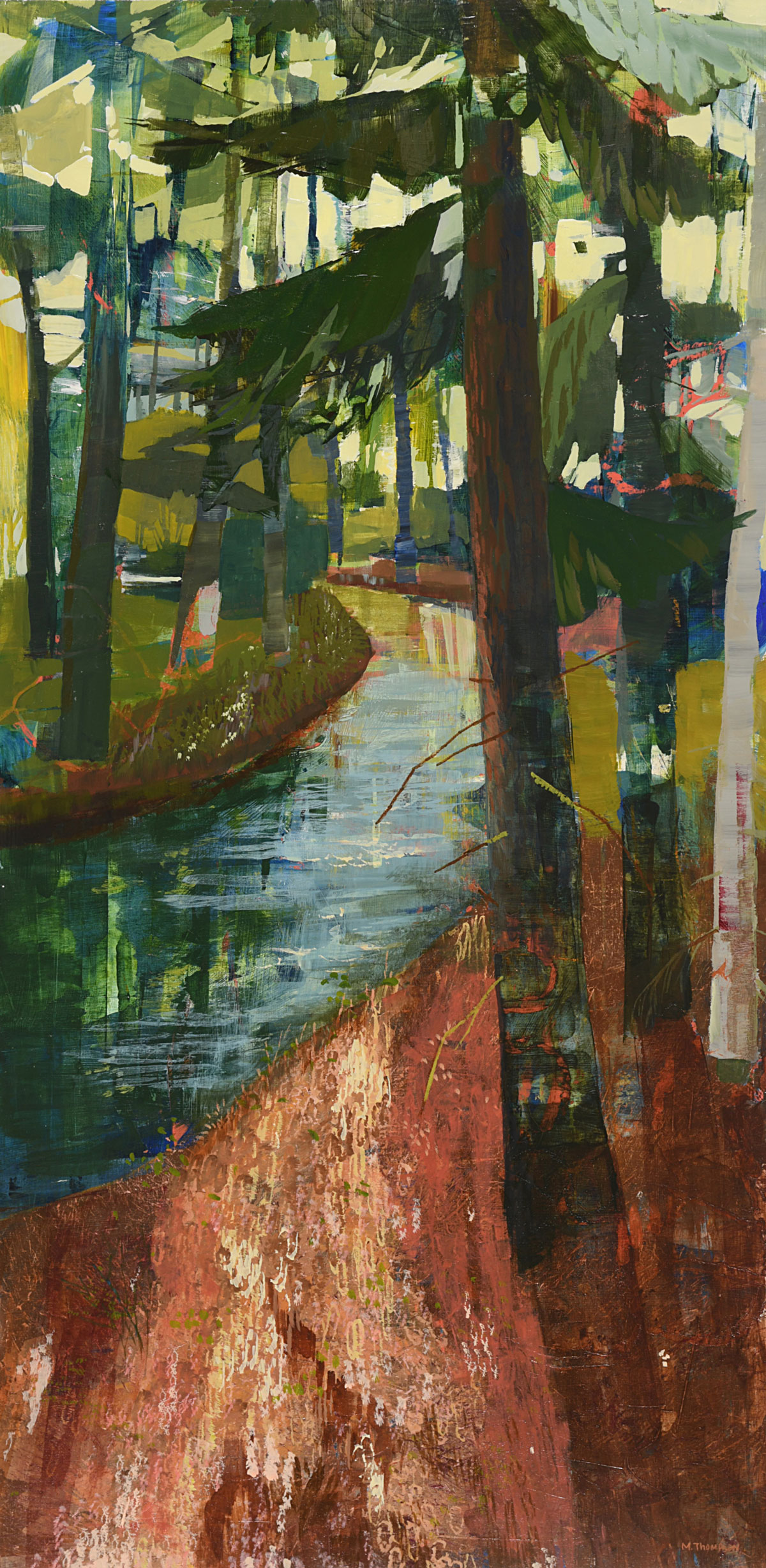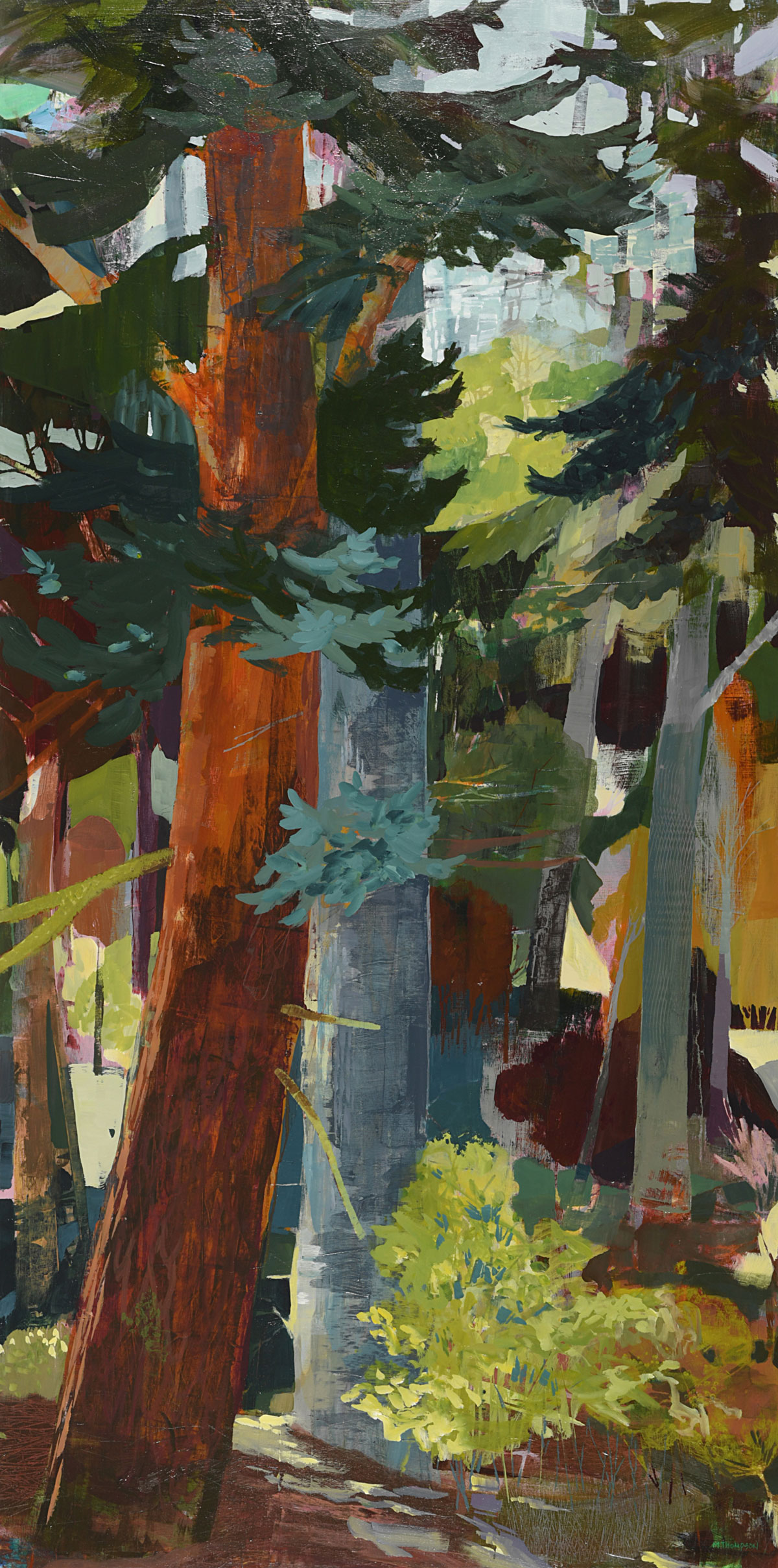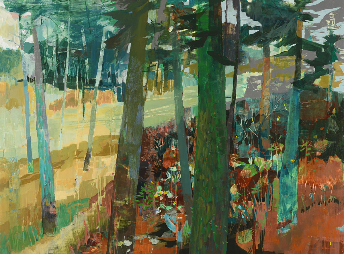 Thompson’s rich, layered and textural paintings offer portals into landscapes that feel both intimate and expansive. These semi-abstract forest and mountain landscapes are not depictions of specific places but are instead invitations—openings into a sensed terrain that lives between representation and abstraction. Each painting offers a moment of pause between here and there: a still point in the forest, a threshold of light, a meandering path or dissolving waterway, a glimmer of what might lie just beyond view.
