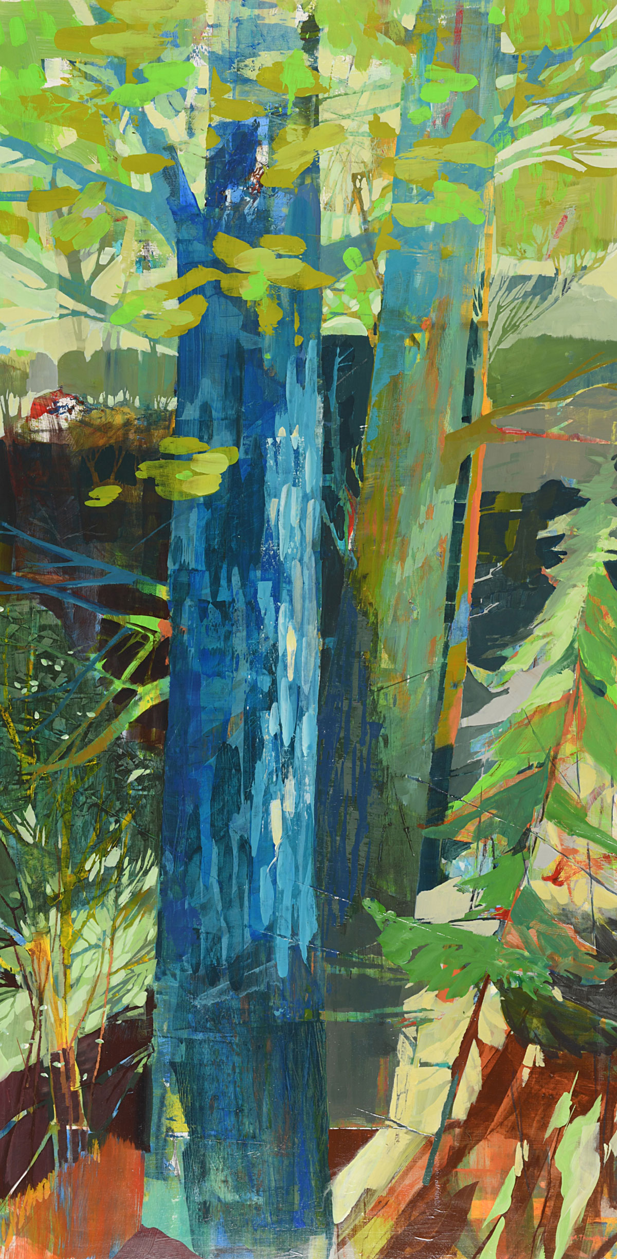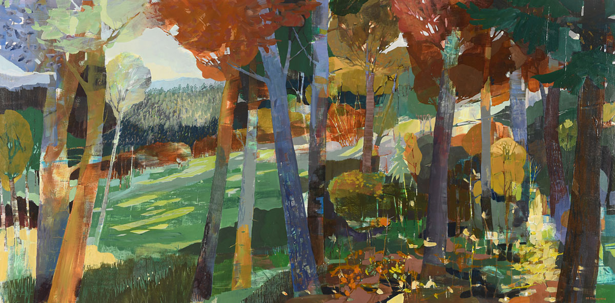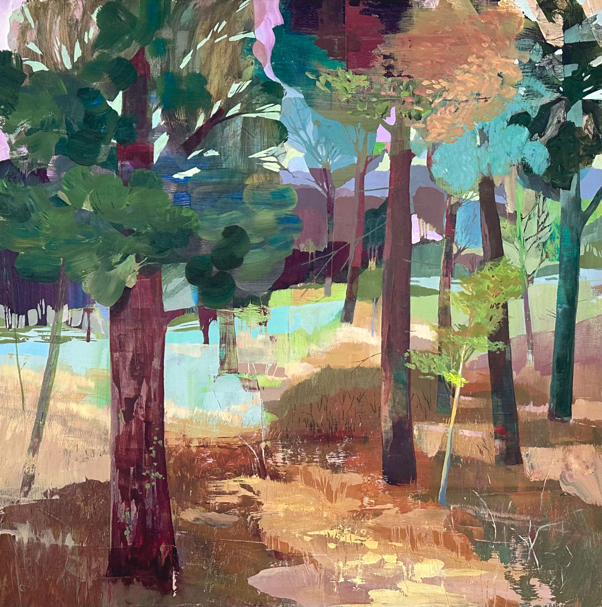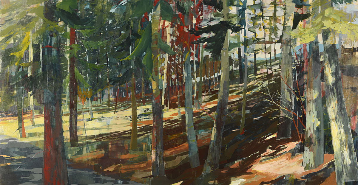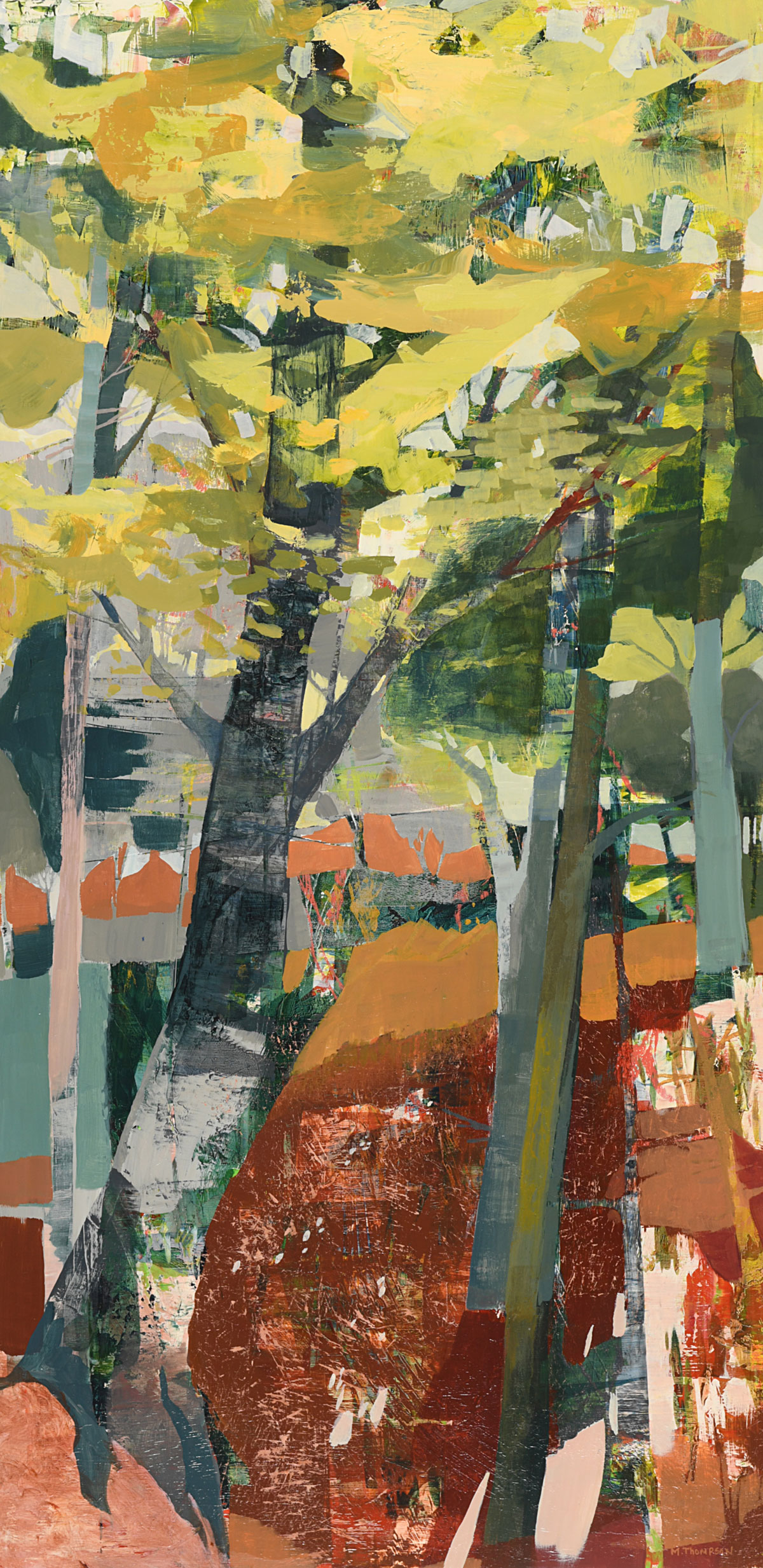 Thompson’s rich, layered and textural paintings offer portals into landscapes that feel both intimate and expansive. These semi-abstract forest and mountain landscapes are not depictions of specific places but are instead invitations—openings into a sensed terrain that lives between representation and abstraction. Each painting offers a moment of pause between here and there: a still point in the forest, a threshold of light, a meandering path or dissolving waterway, a glimmer of what might lie just beyond view.